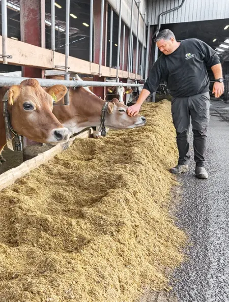 „Ertragsmäßig läuft es gut“, betont er. Das Futter für seine 180 Milchkühe besteht größtenteils aus Mais-, Gras- und Ganzpflanzensilage. Fast zwei Drittel davon baut er selbst an. Er schätzt, dass er den Selbstversorgungsgrad beim Futter durch den Anbau verschiedener Kulturen steigern könnte, zögert aber. Denn er muss zwei Faktoren berücksichtigen: Zeit und Kosten. „Der Anbau zusätzlicher Kulturen würde einen höheren Arbeitseinsatz erfordern, und die Frage ist, ob dieser durch den höheren Selbstversorgungsgrad angemessen honoriert wird. Das ist eine Entscheidung, die ich treffen muss“, gibt er ehrlich zu.