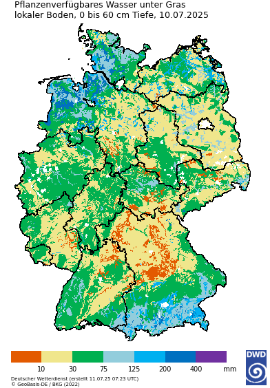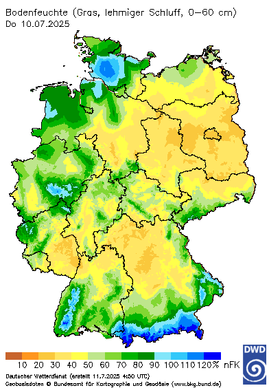 - Funktion: Hier können sich Landwirte eine grafische Darstellung der aktuellen Bodenfeuchte in Deutschlandanschauen. Die Karte zeigt farbcodierte Abweichungen vom Normalwert und erlaubt den Rückblick auf die Bodenfeuchteentwicklung der letzten zwölf Monate.