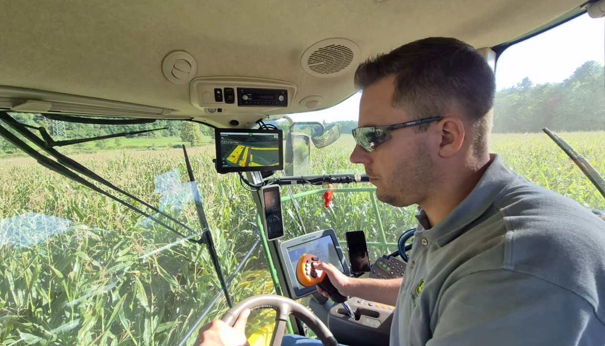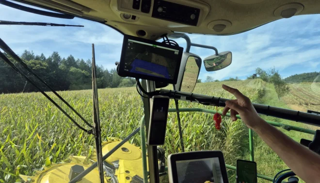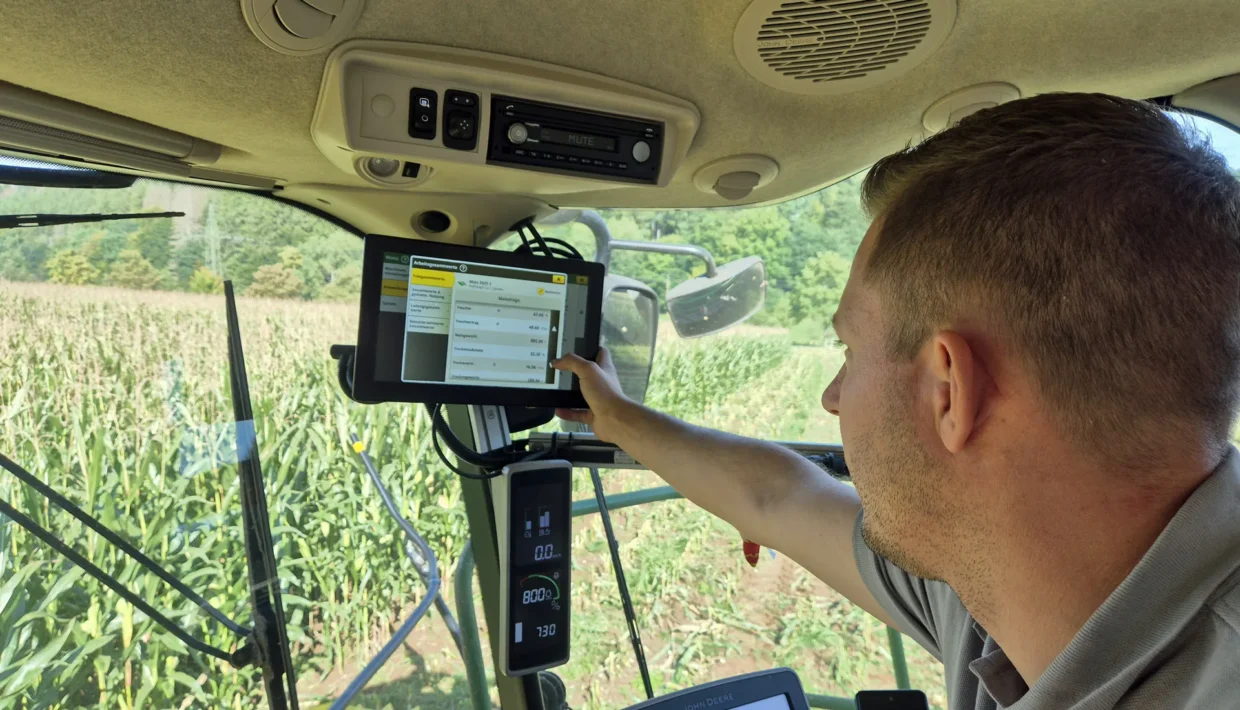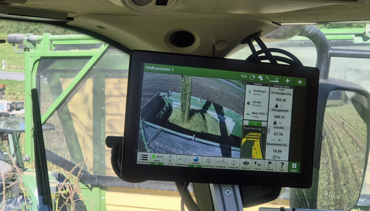 Gerade hat Laurin Müller die letzten Maisreihen auf einem hängigen Flurstück gehäckselt und muss nun auf das Nachbargrundstück, welches unmittelbar am Rand eines Waldes lieg, umsetzen. Um das Feld besser abschätzen zu können, schaut er erst einmal auf seinen Monitor und entdeckt, dass am gegenüberliegenden Feldrand in einer Einbuchtung einige Obstbäume stehen. „Seit wir Google Maps in unseren Monitor integriert haben, ist es für die Fahrer wesentlich einfacher, Hindernisse frühzeitig zu erkennen“, erläutert er.