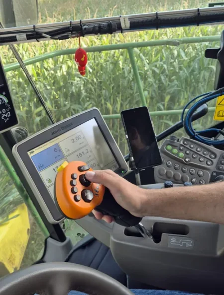 „Eigentlich ist ein Feldhächslerfahrer ein Schrauber“, erzählt Laurin Müller weiter. „Da die Maschine so stark beansprucht wird, gibt es viele Verschleißteile, die immer wieder ausgetauscht werden müssen. Ich habe immer einen Overall in der Kabine dabei.“ Der Hang zum Tüfteln und Ausprobieren zeigt sich auch in der Kabine. Beispielsweise denke der Ingenieur darüber nach, ob das zusätzliche Display in der oberen rechten Ecke der Kabine richtig positioniert ist, oder ob es da nicht doch noch einen ergonomischeren Platz gibt. Auch den Halter für das Mobiltelefon rechts neben der Bedienkonsole gibt es bisher nicht auf Serienmaschinen – ob es ihn jemals geben entscheidet bei John Deere ein umfangreicher Evaluierungsprozesses. Auf jeden Fall hilft die Arbeit als Häckslerfahrer während seiner Freizeit Laurin Müller dabei, die Anforderungen seiner Kunden besser zu verstehen, und sie gibt ihm wertvolle Impulse für seinen Hauptberuf als Entwicklungsingenieur.