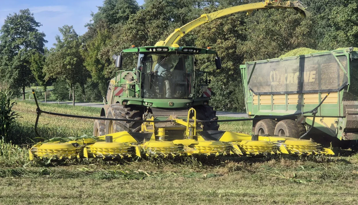 Hier im Westen Deutschlands, nahe an der Grenze zu Luxemburg und Frankreich sind die Felder klein, hügelig und von unregelmäßiger Form. In diesem Jahr gab es genügend Regen und der Mais steht hochgewachsen auf den Feldern. Noch ist das Wetter sonnig und warm – optimal für die bevorstehende Maisernte. Insgesamt sollen heute 30 ha Mais auf 15 unterschiedlichen Feldern geerntet werden.